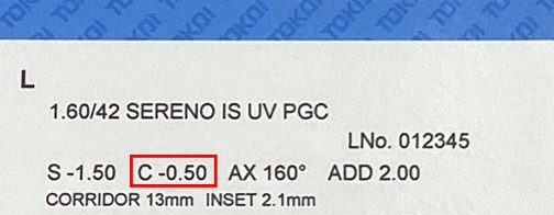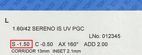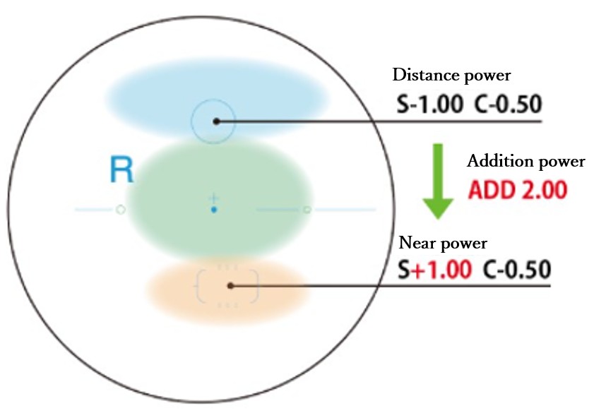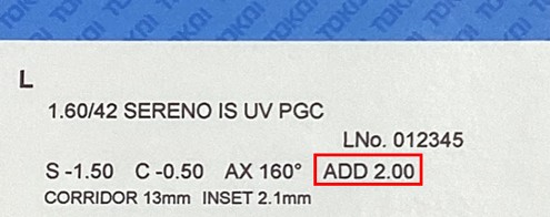 The values of “S” and “C” written on lens bags represent the power for distance vision, so the power for near vision can be expressed by adding the “ADD” value.