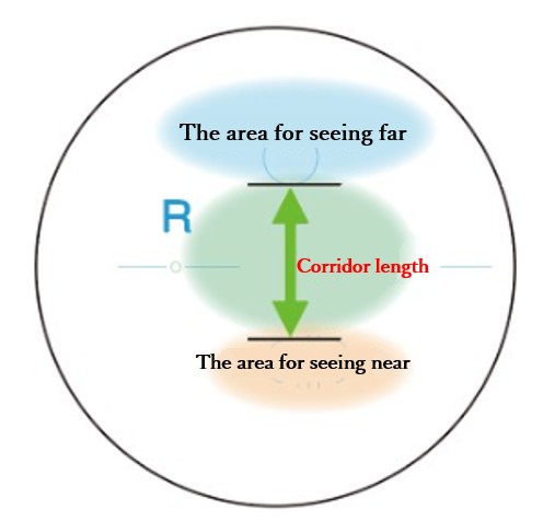 Progressive lenses are designed so that the lens power changes continuously from the distance power to near power. This “length of the area where the power changes continuously” is called “the corridor length.”