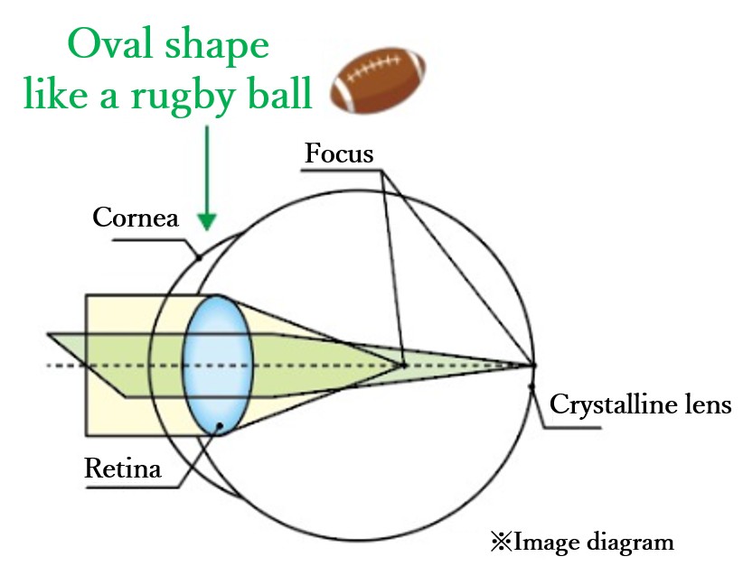 In the case of astigmatism, the cornea and the crystalline lens, which play a role in the eye’s lenses, have an oval shape like a rugby ball.