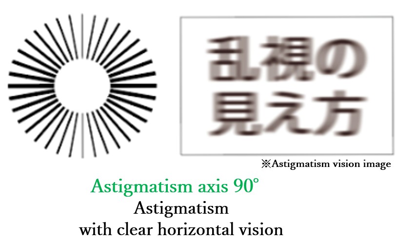 In the case of the astigmatism axis of 90°, vision is clearer in the horizontal direction but blurred in the vertical direction, which is the opposite of when the axis is at 180°.