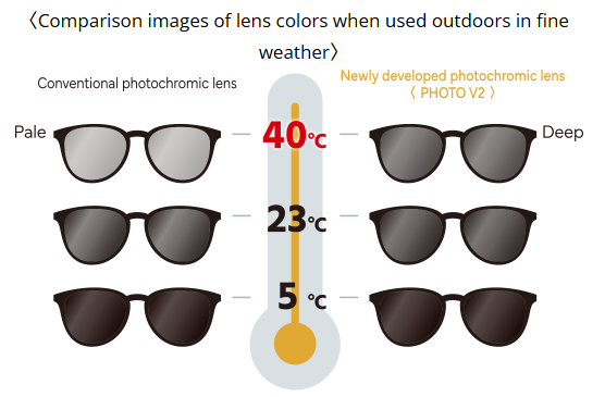 The most significant feature of the newly released “Lutina Photo Version2” a high-level photochromic lens with a feature of deepening the density of lens color, which has overcome a shortcoming of conventional photochromic lens that is difficult to change the color density at high temperatures.